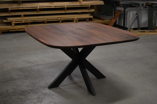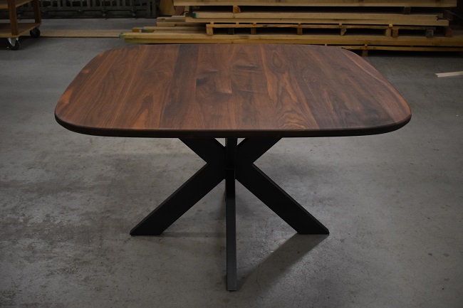 Vierkante notenhouten eettafel met afgeronde hoeken en zwarte matrix spinpoot € 1795,-