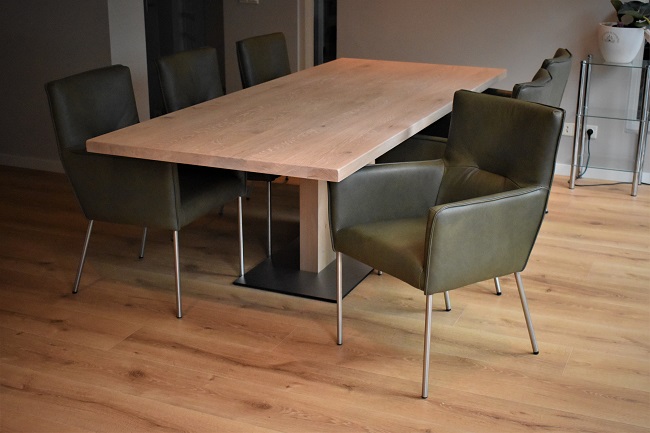 Tafelonderstel met rvs vloerplaat en eiken kolom € 495,-